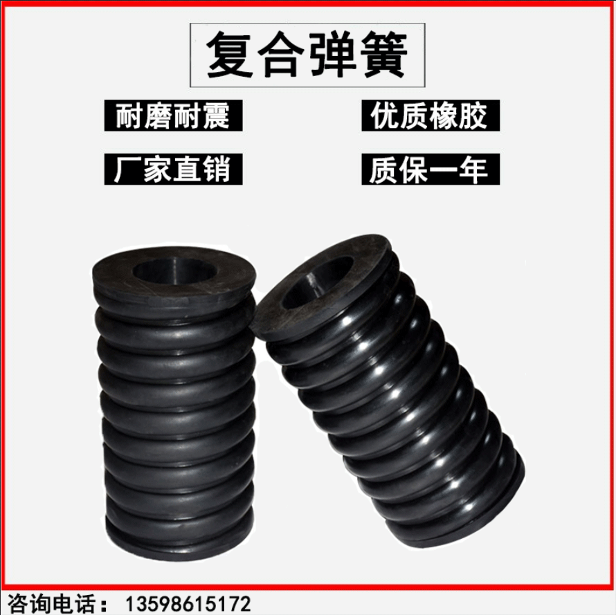 復(fù)合彈簧:是由鋼螺旋彈簧及其外邊包裹的硫化橡膠共同構(gòu)成。集鋼簧和橡膠彈簧的優(yōu)點(diǎn)于一體,克服了金屬?gòu)椈蓜傂源蟆⒐ぷ髟胍舾呒跋鹉z彈簧承重量小。