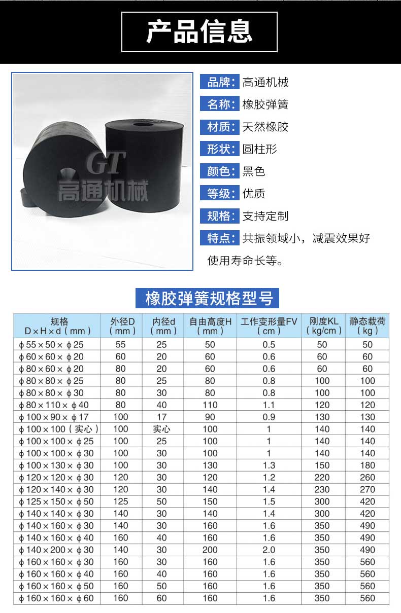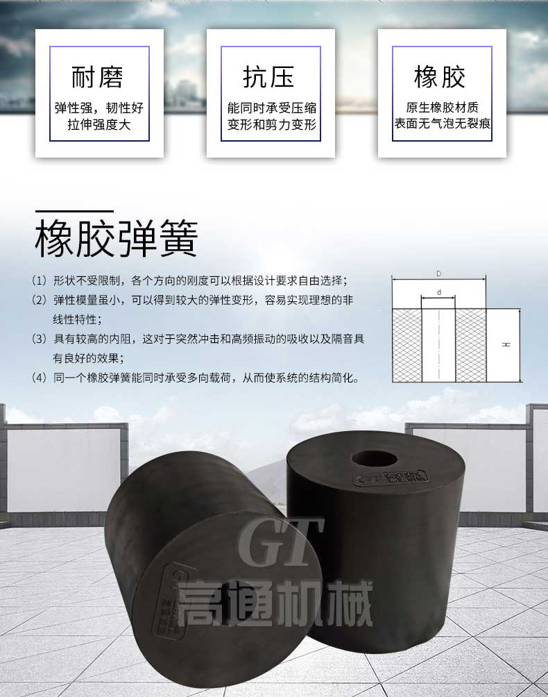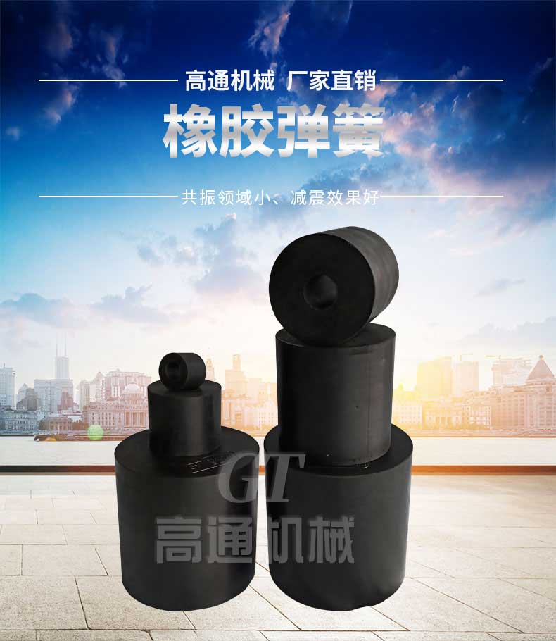 橡膠彈簧:是一種高彈性體,制作材料有普通橡膠。橡膠彈簧彈性模量小,受載后有較大的彈性變形,借以吸收沖擊和振動。它能同時受多向載荷,但耐高溫性和耐油性比鋼彈簧差。如有特殊要求可用耐油橡膠制成。該產品減振效果好,共振領域小,使用壽命長,成本低,還有良好的耐寒性,優良的氣密性,防水性,電絕緣性,是減振的最佳選擇。
